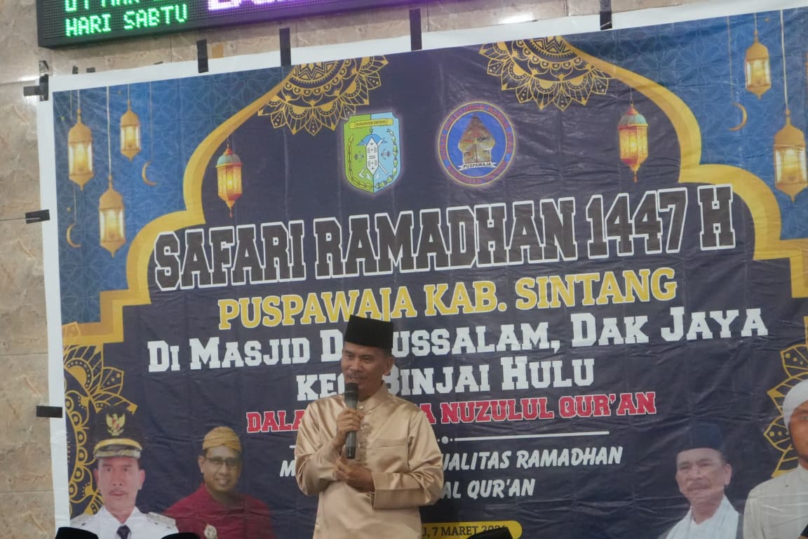 Sintang-Bupati Sintang Gregorius Herkulanus Bala menghadiri acara safari ramadhan dan buka puasa bersama yang diselenggarakan oleh Pusat Paguyuban Warga Jawa (Puspawaja) Kabupaten Sintang di Masjid Darussalam Desa Dak Jaya Kecamatan Binjai Hulu pada Sabtu, 7 Maret 2026.
