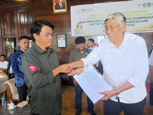 Bupati Sintang Jarot Winarno menyerahkan Surat Keputusan (SK) tentang penetapan Rimba Gupung langsung kepada masyarakat di empat desa di Kabupaten Sintang, 10 Oktober 2024.